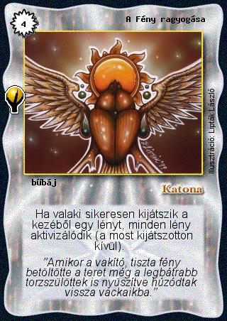 Kiadás: Alappakli, 5. kiadás (Ősök városa), Alappakli, 6. kiadás (Ősök Városa), Alappakli, 7. kiadás (Ősök Városa) Gyakoriság: ritka Lapszín (isten): Katona Klán Típus: bűbáj Szöveg: Ha valaki sikeresen kijátszik a kezéből egy lényt, minden lény aktivizálódik (a most kijátszotton kívül). Szinesítő szöveg: "Amikor a vakító, tiszta fény betöltötte a teret még a legbátrabb torzszülöttek is nyüszítve húzódtak vissza vackaikba." Illusztráció: Lipták László