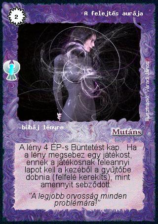 Kiadás: Ébredés Gyakoriság: nem gyakori Lapszín (isten): Mutáns Klán Típus: bűbáj lényre Szöveg: A lény 4 ÉP-s Büntetést kap. Ha a lény megsebez egy játékost, ennek a játékosnak feleannyi lapot kell a kezéből a gyűjtőbe dobnia (felfelé kerekíts), mint amennyit sebződött. Szinesítő szöveg: "A legjobb orvosság minden problémára!" Illusztráció: Váradi János