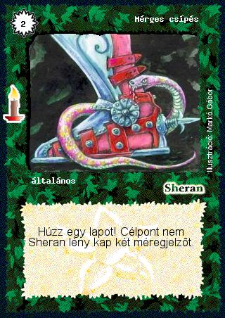 Kiadás: Múltidéző Gyakoriság: gyakori Lapszín (isten): Sheran Típus: általános Szöveg: Húzz egy lapot! Célpont nem Sheran lény kap két méregjelzőt. Illusztráció: Markó Gábor